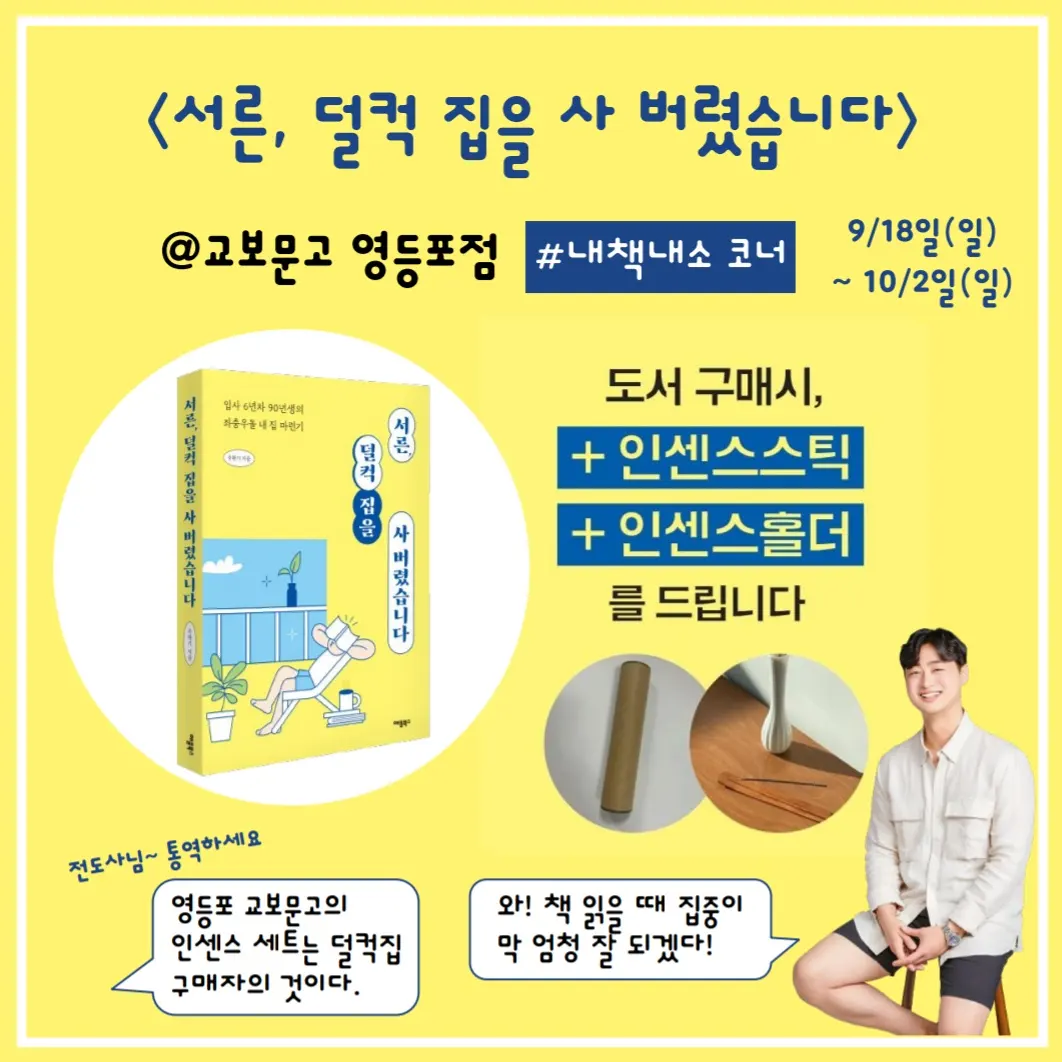 🏡 2주 간의 행사기간 동안 현장 구매시 인센스 스틱과 홀더를 선물로 드립니다^-^ 향초 켜 놓고 책 읽고 글 쓰면 집중이 을마나 잘 되게요?? (통역: 수리남의 홍어는.. 이 아니라, 영등포 교보의 인센스는 덜컥집 구매자의 것이다)